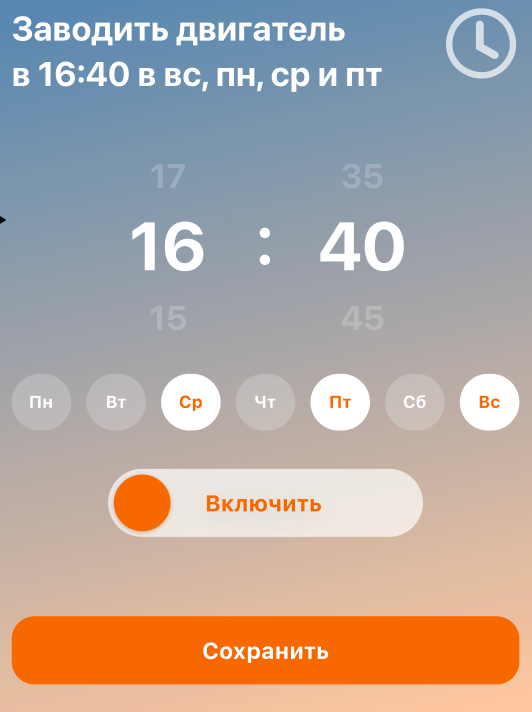 Автозапуск по расписанию позволяет задать сценарии автоматического запуска двигателя в необходимые время и дни недели.